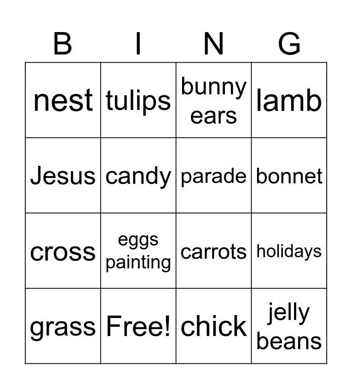 This bingo card has 16 words: Free!, holidays, bunny ears, nest, cross, tulips, carrots, chick, Jesus, candy, grass, lamb, eggs painting, bonnet, parade and jelly beans.
