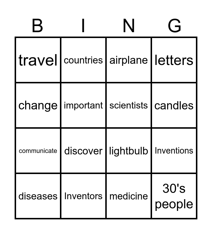 This bingo card has 16 words: Inventors, Inventions, airplane, travel, communicate, countries, lightbulb, medicine, change, important, diseases, letters, discover, candles, scientists and 30's people.