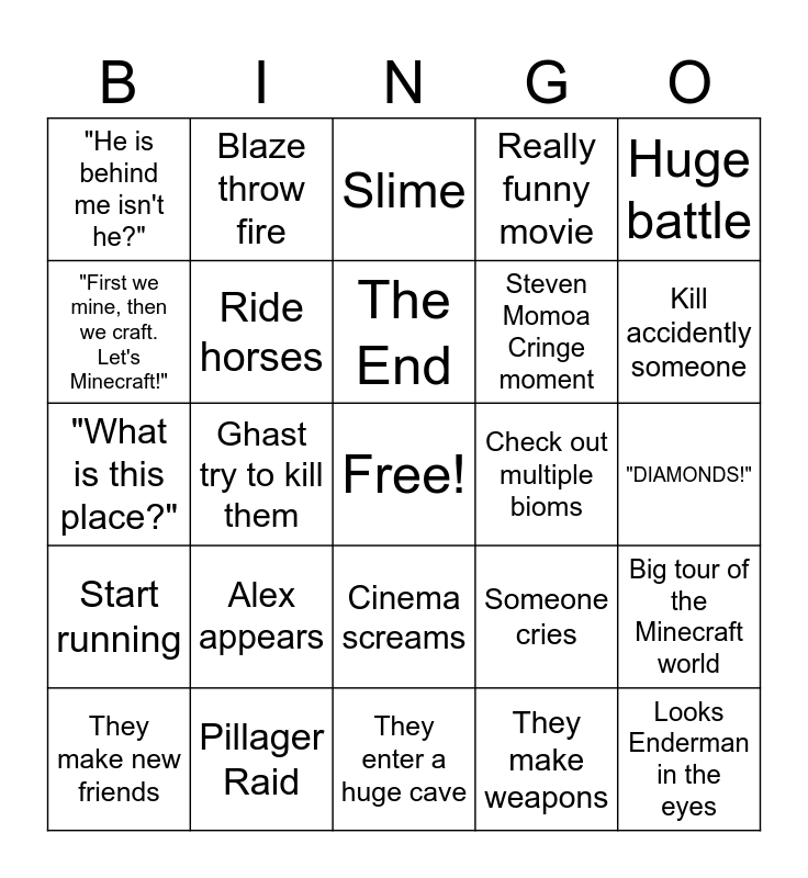 This bingo card has a free space and 24 words: Alex appears, Pillager Raid, The End, They make new friends, Huge battle, "He is behind me isn't he?", "First we mine, then we craft. Let's Minecraft!", Blaze throw fire, Check out multiple bioms, Cinema screams, Steven Momoa Cringe moment, "What is this place?", Someone cries, Big tour of the Minecraft world, Ride horses, They make weapons, "DIAMONDS!", Slime, Kill accidently someone, Ghast try to kill them, Looks Enderman in the eyes, Start running, Really funny movie and They enter a huge cave.
