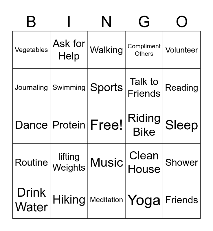 This bingo card has a free space and 29 words: Drink Water, Fruit, Protein, Milk, Vegetables, Walking, Swimming, lifting Weights, Riding Bike, Hiking, Sleep, Friends, Meditation, Yoga, Reading, Stretching, Music, Routine, Volunteer, Dance, Clean House, Healthy Cooking, Talk to Friends, Journaling, Compliment Others, Ask for Help, Shower, Sports and Go out with Friends.