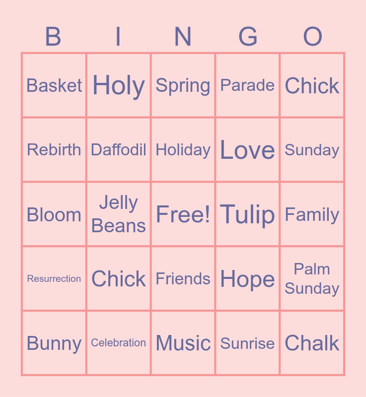 This bingo card has a free space and 29 words: Bunny, Chocolate, Jelly Beans, Hunt, Basket, Spring, Daffodil, Chick, Tulip, Celebration, Family, Chalk, Music, Sunrise, Sunday, Carrot, Friends, Resurrection, Chick, Bloom, Hope, Church, Love, Rebirth, Parade, Holy, Palm Sunday, Holiday and Candy.