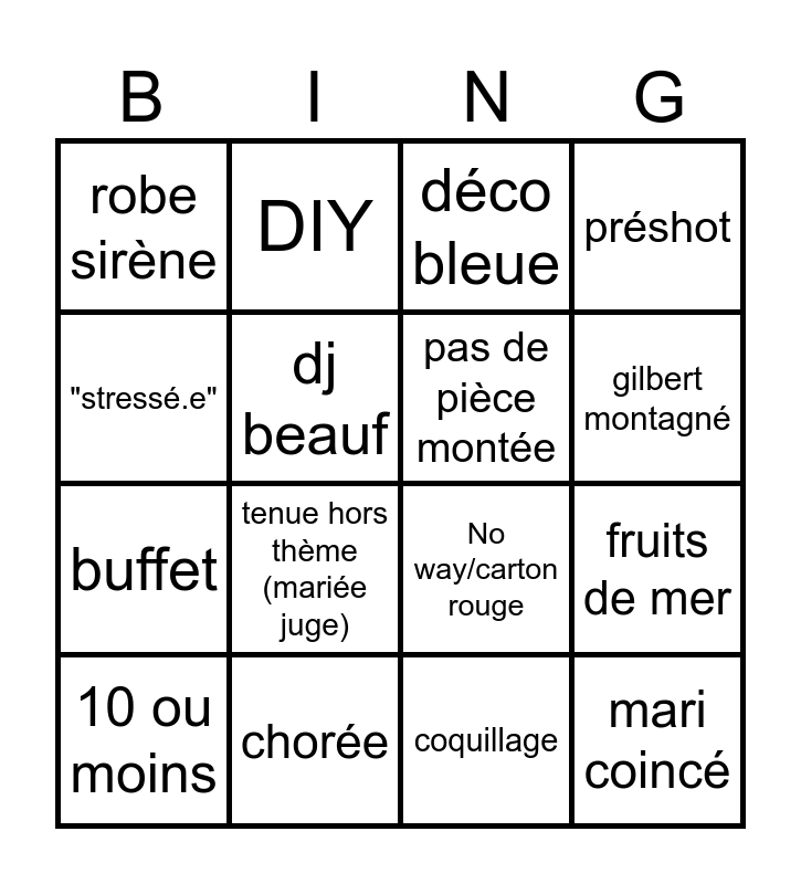 This bingo card has 16 words: chorée, fruits de mer, déco bleue, robe sirène, buffet, DIY, No way/carton rouge, coquillage, "stressé.e", dj beauf, 10 ou moins, préshot, tenue hors thème (mariée juge), gilbert montagné, pas de pièce montée and mari coincé.