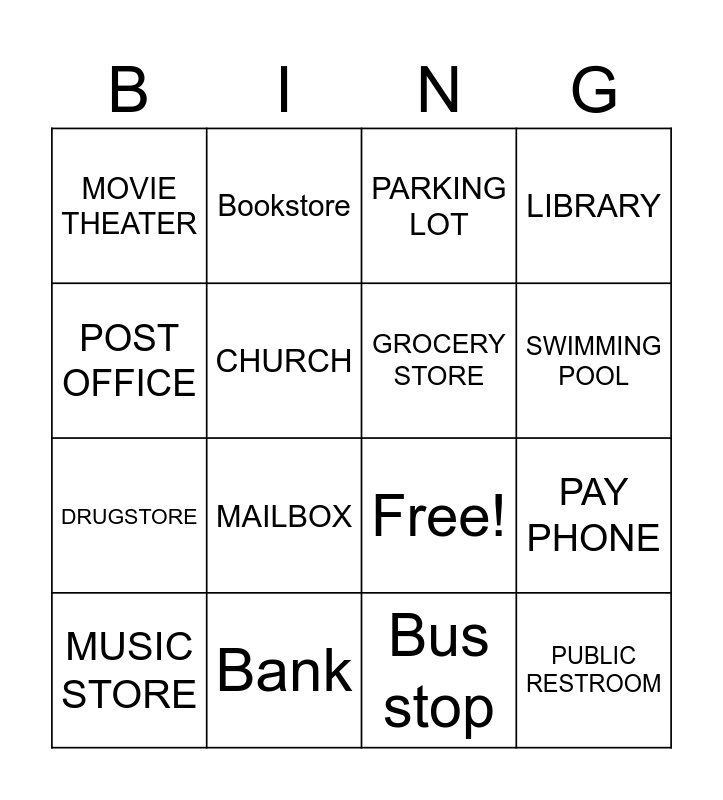 This bingo card has 21 words: Bank, Chinese Resturant, Bookstore, Park, Bus stop, GROCERY STORE, MOVIE THEATER, PARKING LOT, Free!, SWIMMING POOL, DRUGSTORE, LIBRARY, PUBLIC RESTROOM, TRAVEL AGENT, CHURCH, NEWSSTAND, MUSIC STORE, MAILBOX, POST OFFICE, PAY PHONE and ITALIAN RESTUARENT.