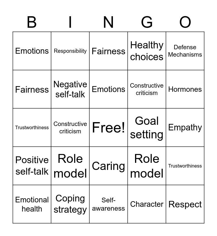 This bingo card has a free space and 42 words: Citizenship, Emotions, Integrity, Role model, Character, Trustworthiness, Respect, Responsibility, Fairness, Caring, Empathy, Hormones, Constructive criticism, Defense Mechanisms, Integrity, Role model, Character, Trustworthiness, Respect, Responsibility, Fairness, Caring, Citizenship, Emotions, Empathy, Hormones, Constructive criticism, Defense mechanism, Repression, Denial, Projection, Positive self-talk, Negative self-talk, Self-awareness, Self-respect, Emotional health, Coping strategy, Goal setting, Mistakes, Stress, Healthy choices and Mental health.