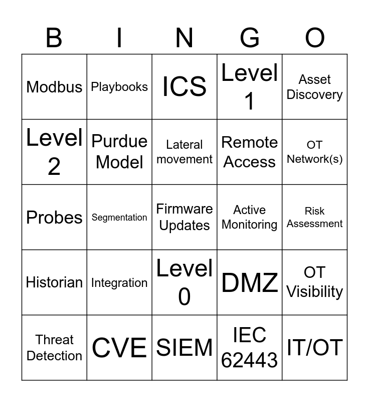This bingo card has 35 words: SCADA, PLC, HMI, Purdue Model, Level 0, Level 1, Level 2, Anomaly Detection, Lateral movement, Sensors, Probes, Asset Discovery, Passive Monitoring, Protocol Inspection, Modbus, Active Monitoring, IEC 62443, Segmentation, Historian, Firmware Updates, DMZ, Threat Detection, OT Visibility, CVE, ICS, OT Network(s), IT/OT, Engineering Workstation, Remote Access, Risk Assessment, NIS2, SIEM, Integration, Playbooks and Project file.