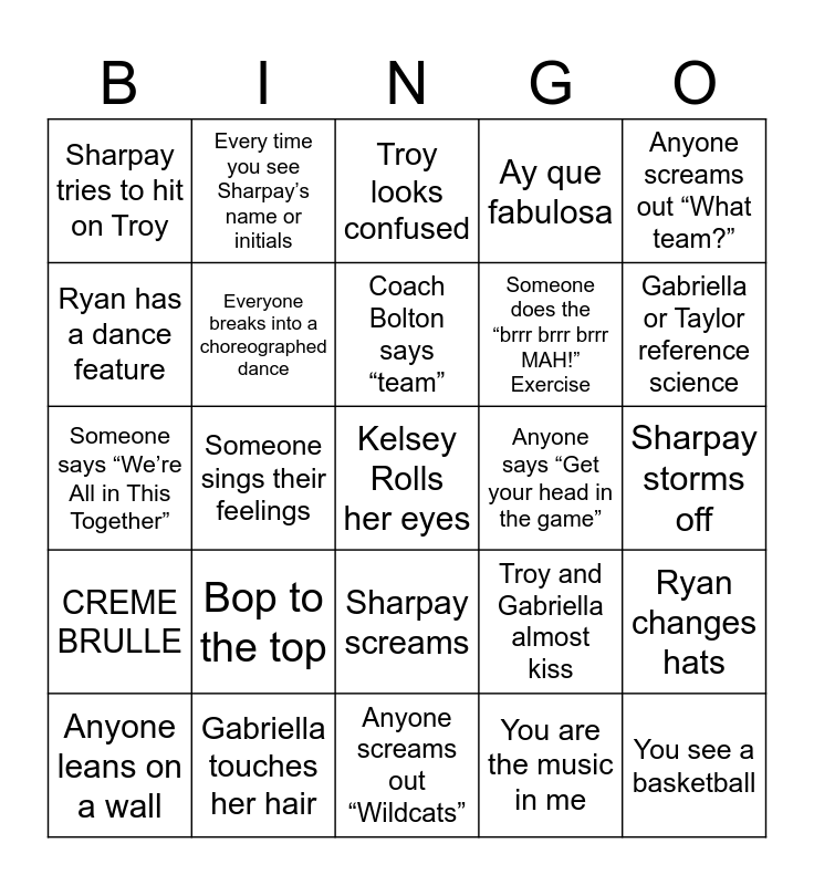 This bingo card has 25 words: Bop to the top, Anyone screams out “Wildcats”, Coach Bolton says “team”, Anyone leans on a wall, Anyone screams out “What team?”, Sharpay tries to hit on Troy, Ryan has a dance feature, Every time you see Sharpay’s name or initials, Anyone says “Get your head in the game”, Sharpay screams, Someone does the “brrr brrr brrr MAH!” Exercise, Someone says “We’re All in This Together”, Troy and Gabriella almost kiss, Ryan changes hats, Everyone breaks into a choreographed dance, You see a basketball, Sharpay storms off, Troy looks confused, Gabriella or Taylor reference science, Someone sings their feelings, Kelsey Rolls her eyes, Gabriella touches her hair, CREME BRULLE, Ay que fabulosa and You are the music in me.