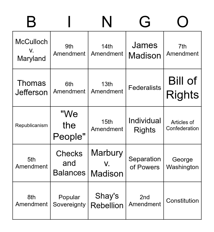 This bingo card has a free space and 34 words: 1st Amendment, 2nd Amendment, 3rd Amendment, 4th Amendment, 5th Amendment, 6th Amendment, 7th Amendment, 8th Amendment, 9th Amendment, 10th Amendment, 13th Amendment, 14th Amendment, Federalism, Limited Government, Individual Rights, Bill of Rights, Popular Sovereignty, Republicanism, Checks and Balances, Separation of Powers, Marbury v. Madison, Gibbons v. Ogden, McCulloch v. Maryland, Articles of Confederation, Shay's Rebellion, Constitution, James Madison, Anti-Fedralist, Federalists, Thomas Jefferson, Alexander Hamilton, "We the People", George Washington and George Mason.