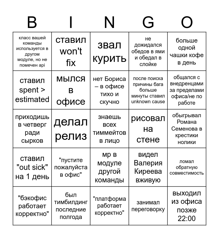 This bingo card has 25 words: "пустите пожалуйста в офис", "платформа работает корректно", нет Бориса – в офисе тихо и скучно, "бэкофис работает корректно", больше одной чашки кофе в день, класс вашей команды используется в другом модуле, но не помечен api, ставил spent > estimated, ставил won't fix, рисовал на стене, мр в модуле другой команды, после поиска причины бага больше минуты ставил unknown cause, приходишь в четверг ради сырков, видел Валерия Киреева вживую, ломал обратную совместимость, мылся в офисе, выходил из офиса позже 22:00, обыгрывал Романа Семенова в крестики нолики, звал курить, общался с внедренцами за пределами офиса/не по работе, делал релиз, знаешь всех тиммейтов в лицо, был тимбилдинг последние полгода, ставил "out sick" на 1 день, не дожидался обедов в ями и обедал в слойке and занимал переговорку.