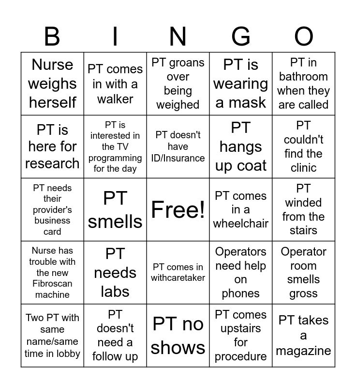 This bingo card has a free space and 24 words: PT needs labs, PT doesn't need a follow up, PT doesn't have ID/Insurance, Two PT with same name/same time in lobby, PT in bathroom when they are called, Nurse weighs herself, PT is here for research, PT comes in with a walker, PT comes in a wheelchair, PT comes in withcaretaker, PT hangs up coat, PT needs their provider's business card, Operators need help on phones, Operator room smells gross, PT is interested in the TV programming for the day, PT comes upstairs for procedure, PT winded from the stairs, PT groans over being weighed, PT couldn't find the clinic, PT smells, PT takes a magazine, Nurse has trouble with the new Fibroscan machine, PT is wearing a mask and PT no shows.