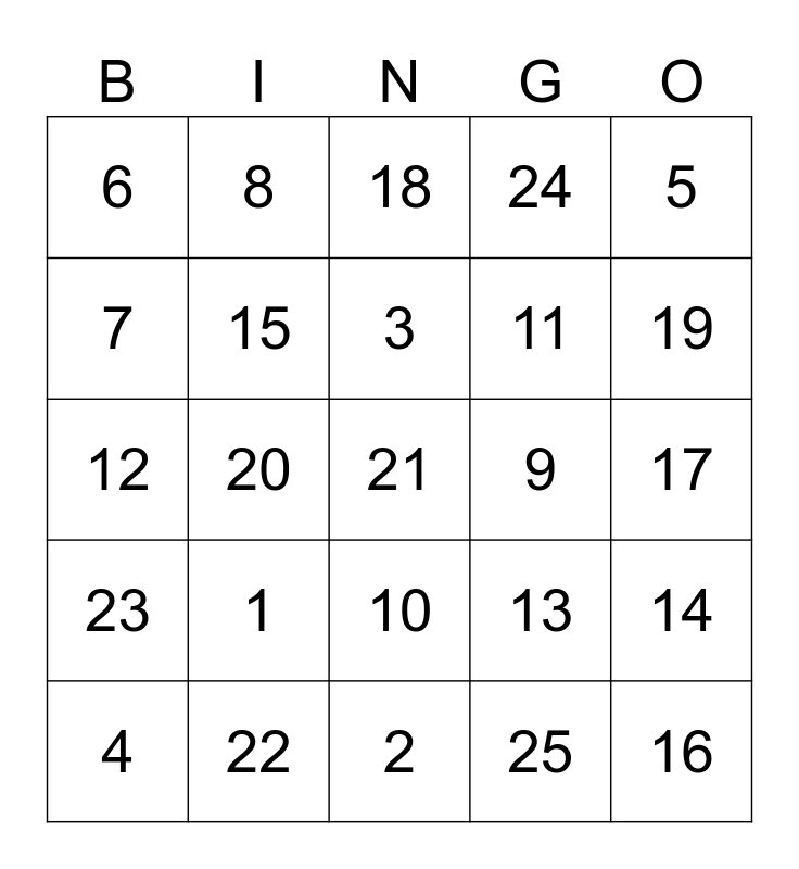 This bingo card has 25 words: 1, 2, 3, 4, 5, 6, 7, 8, 9, 10, 11, 12, 13, 14, 15, 16, 17, 18, 19, 20, 21, 22, 23, 24 and 25.