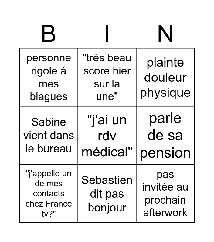 This bingo card has a free space and 8 words: parle de sa pension, plainte douleur physique, "très beau score hier sur la une", "j'appelle un de mes contacts chez France tv?", personne rigole à mes blagues, pas invitée au prochain afterwork, Sabine vient dans le bureau and Sebastien dit pas bonjour.