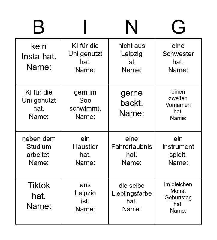 This bingo card has 21 words: aus Leipzig ist. Name:, ein Haustier hat. Name:, KI für die Uni genutzt hat. Name:, schon einen Bachelor/Abschluss hat. Name:, die selbe Lieblingsfarbe hat. Name:, gerne backt. Name:, kein Insta hat. Name:, nicht aus Leipzig ist. Name:, eine Fahrerlaubnis hat. Name:, einen zweiten Vornamen hat. Name:, neben dem Studium arbeitet. Name:, eine Schwester hat. Name:, im gleichen Monat Geburtstag hat. Name:, ein Instrument spielt. Name:, gern im See schwimmt. Name:, tiktok nutzt. Name:, Tiktok hat. Name:, ein Haustier hat. Name:, KI für die Uni genutzt hat. Name:, ein Instrument spielt. Name: and einen zweiten Vornamen hat. Name:.