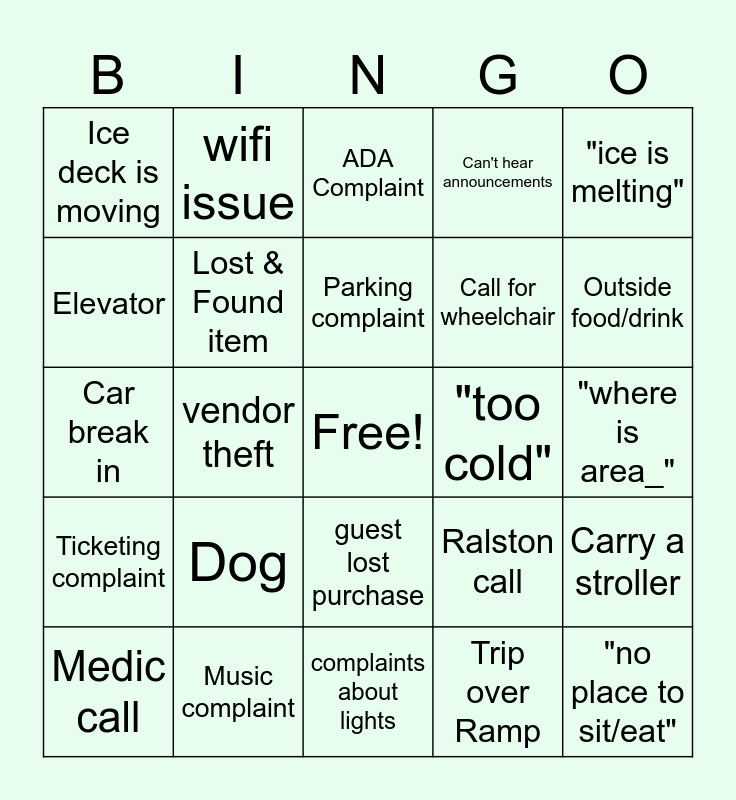 This bingo card has a free space and 24 words: Medic call, Dog, Parking complaint, Trip over Ramp, "ice is melting", Ice deck is moving, wifi issue, ADA Complaint, "too cold", "where is area_", Car break in, Lost & Found item, Ralston call, Carry a stroller, Elevator, Music complaint, complaints about lights, Can't hear announcements, Outside food/drink, Ticketing complaint, vendor theft, guest lost purchase, Call for wheelchair and "no place to sit/eat".