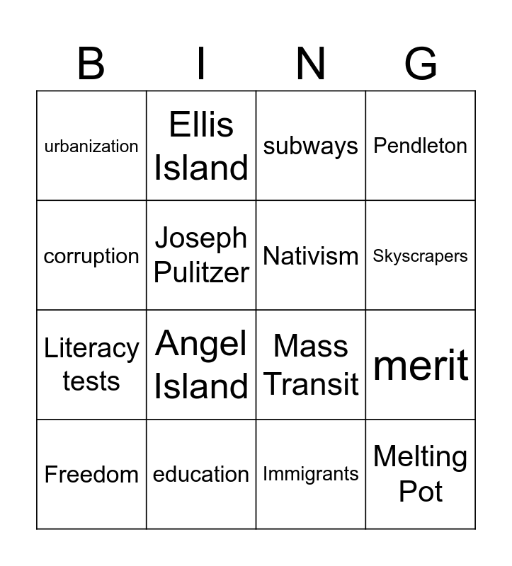 This bingo card has 16 words: education, merit, subways, urbanization, Literacy tests, Ellis Island, Mass Transit, Immigrants, corruption, Joseph Pulitzer, Freedom, Pendleton, Angel Island, Skyscrapers, Nativism and Melting Pot.