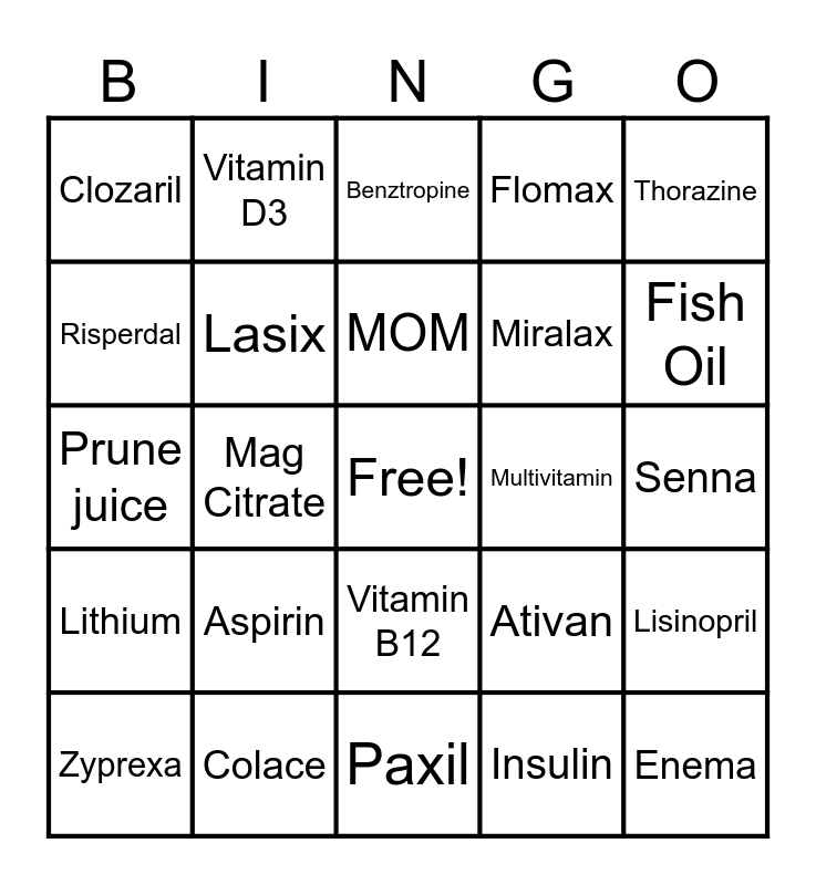 This bingo card has a free space and 24 words: Aspirin, Colace, MOM, Zyprexa, Thorazine, Clozaril, Risperdal, Vitamin D3, Multivitamin, Vitamin B12, Miralax, Prune juice, Ativan, Lisinopril, Lasix, Insulin, Senna, Benztropine, Fish Oil, Mag Citrate, Enema, Lithium, Flomax and Paxil.