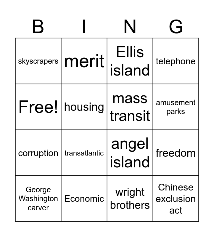This bingo card has 16 words: Economic, freedom, Ellis island, skyscrapers, corruption, merit, angel island, wright brothers, Free!, housing, George Washington carver, telephone, transatlantic, amusement parks, mass transit and Chinese exclusion act.