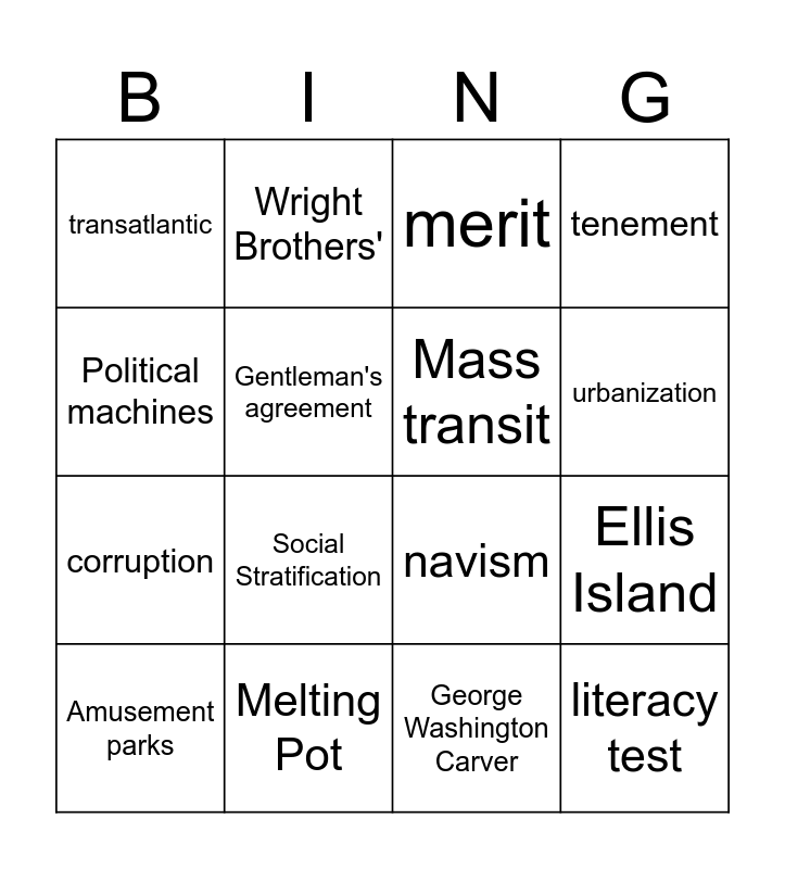 This bingo card has 16 words: Melting Pot, Ellis Island, merit, transatlantic, corruption, Wright Brothers', navism, George Washington Carver, Political machines, Gentleman's agreement, Amusement parks, tenement, Social Stratification, urbanization, Mass transit and literacy test.