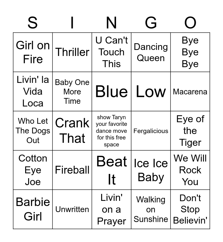This bingo card has a free space and 39 words: Africa, Al Star, Axel F, Baby One More Time, Barbie Girl, Beat It, Blue, Bohemian Rhapsody, Bye Bye Bye, Cotton Eye Joe, Crank That, Dancing Queen, Don't Stop Believin', Eye of the Tiger, Fergalicious, Fireball, Firework, Girl on Fire, Happy, Ice Ice Baby, Livin' la Vida Loca, Livin' on a Prayer, Low, Macarena, Mambo No. 5, Mamma Mia, Roar, Shut Up and Dance, Stronger, Thriller, TiK ToK, Timber, U Can't Touch This, Unwritten, Walking on Sunshine, Wannabe, We Will Rock You, Who Let The Dogs Out and Ymca.
