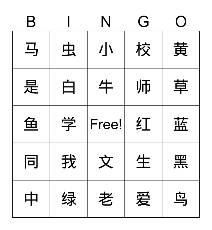 This bingo card has a free space and 24 words: 我, 绿, 牛, 中, 黄, 马, 是, 虫, 红, 文, 师, 鱼, 生, 黑, 白, 爱, 蓝, 小, 草, 学, 鸟, 同, 校 and 老.
