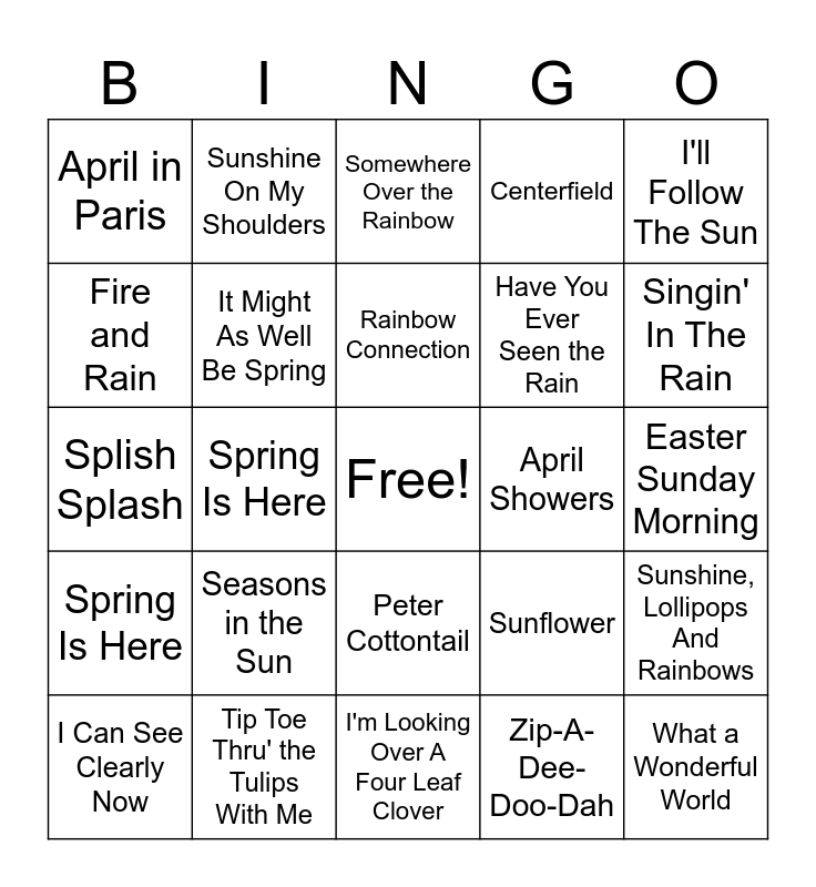 This bingo card has a free space and 29 words: I Can See Clearly Now, Here Comes the Sun, Spring Is Here, You Are My Sunshine, April in Paris, Somewhere Over the Rainbow, It Might As Well Be Spring, Seasons in the Sun, April Showers, Tip Toe Thru' the Tulips With Me, Easter Sunday Morning, What a Wonderful World, I'm Looking Over A Four Leaf Clover, Zip-A-Dee-Doo-Dah, Singin' In The Rain, Tutti Fruitti, Peter Cottontail, Spring Is Here, I'll Follow The Sun, Splish Splash, Sunflower, Lovely Day, Have You Ever Seen the Rain, Fire and Rain, Centerfield, Sunshine On My Shoulders, Sunshine, Lollipops And Rainbows, Rainbow Connection and Rainy Days And Mondays.