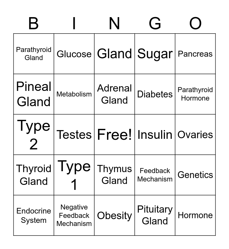 This bingo card has a free space and 24 words: Endocrine System, Type 1, Adrenal Gland, Pituitary Gland, Pancreas, Parathyroid Gland, Glucose, Gland, Insulin, Ovaries, Type 2, Metabolism, Feedback Mechanism, Genetics, Pineal Gland, Negative Feedback Mechanism, Obesity, Sugar, Parathyroid Hormone, Thyroid Gland, Testes, Thymus Gland, Diabetes and Hormone.