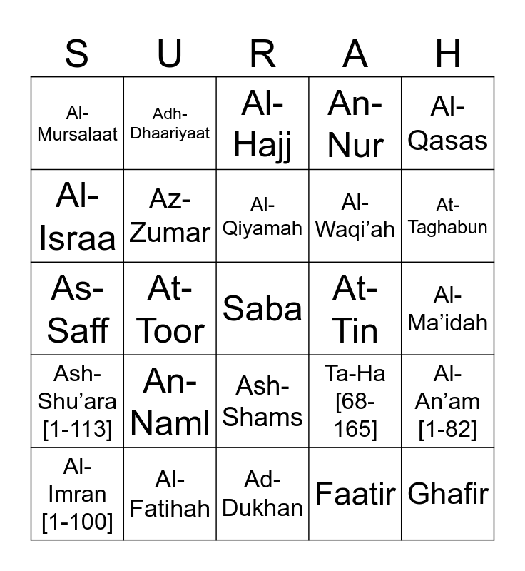 This bingo card has 125 words: Saad, Al-Kaafiroon, Al-Ikhlas, As-Sajdah, Al-Ghaashiyah, At-Tahreem, Ash-Shu’ara [1-113], Al-Muddaththir, Faatir, Al-Hadeed, Ar-Rum, Al-Infitar, Nuh, Al-Bayyinah, An-Nisa [1-88], As-Saafaat [1-91], Al-Fatihah, Al-Qadr, Al-Fajr, Al-Imran [101-200], Ghafir, As-Saff, Al-Kahf, An-Najm, Al-Ahzaab, Al-Qiyamah, An-Nur, Ash-Shu’ara [114-227], Ash-Sharh, Fussilat, Al-An’am [1-82], Al-Hashr, At-Toor, An-Naml, Al-Inshiqaaq, Al-Mujadila, Al-Baqarah [1-95], Al-Masad, Ar-Ra’d, Ar-Rahman, Al-Mursalaat, As-Saafaat [92-182], Al-Qalam, Al-A’la, Al-Jinn, At-Takweer, Al-Munafiqoon, Al-Qasas, An-Naas, Al-Haaqqa, An-Nahl [1-64], Al-Maa’oon, Al-A’raf [103-206], Al-Qaari’ah, An-Nahl [65-128], An-Naba’, An-Nisa [89-176], At-Tawbah [1-64], Al-Hijr, At-Tin, Al-Israa, At-Tawbah [65-129], Az-Zukhruf, Al-An’am [83-165], Ash-Shura, An-Naazi’aat, Al-Kawthar, Ash-Shams, Ad-Dhuha, Al-Ma’idah, Al-Humazah, Al-Burooj, Al-Anfal, Luqmaan, Al-Insaan, Al-Mulk, Al-Furqan, Az-Zalzalah, Al-Baqarah [192-286], Al-Fil, Maryam, Al-A’raf [1-103], Al-Baqarah [96-191], Al-Imran [1-100], Az-Zumar, Al-Ahqaaf, Muhammad, Ibrahim, At-Takaathur, Al-Alaq, Yunus, Abasa, Ta-Ha [1:67], Ya-Sin, Al-Hajj, Ad-Dukhan, Al-Layl, Al-Muzzammil, At-Talaq, Saba, Al-’Aadiyat, Ta-Ha [68-165], An-Nasr, Al-Jumu’ah, Al-Anbiya, Al-Balad, Al-’Asr, At-Taghabun, Al-Jaathiyah, Quraish, Hud, Al-Fath, At-Taariq, Al-Qamar, Al-Mutaffifeen, Al-Ankabut, Al-Mu’minun, Al-Falaq, Qaaf, Al-Waqi’ah, Al-Ma’aarij, Al-Hujuraat, Yusuf, Adh-Dhaariyaat and Al-Mumtahanah.