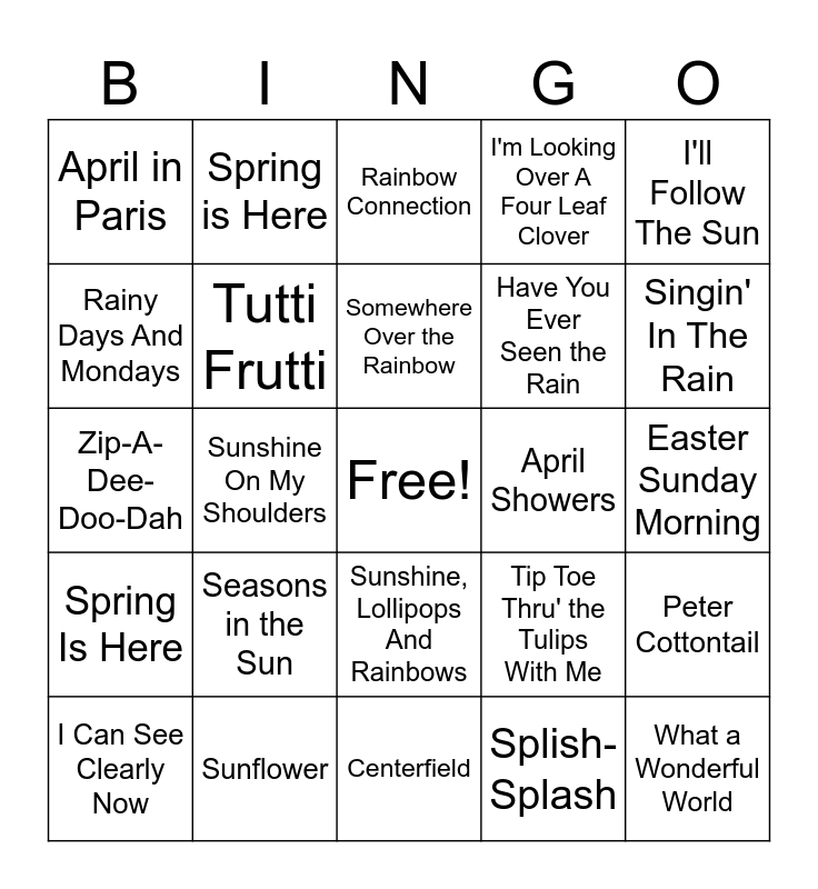 This bingo card has a free space and 29 words: I Can See Clearly Now, Here Comes the Sun, Sunshine On My Shoulders, You Are My Sunshine, April in Paris, Rainbow Connection, Tutti Frutti, Seasons in the Sun, April Showers, Sunflower, Easter Sunday Morning, What a Wonderful World, Centerfield, Splish-Splash, Singin' In The Rain, It Might As Well Be Spring, Sunshine, Lollipops And Rainbows, Spring Is Here, I'll Follow The Sun, Zip-A-Dee-Doo-Dah, Tip Toe Thru' the Tulips With Me, Lovely Day, Have You Ever Seen the Rain, Rainy Days And Mondays, I'm Looking Over A Four Leaf Clover, Spring is Here, Peter Cottontail, Somewhere Over the Rainbow and Fire and Rain.