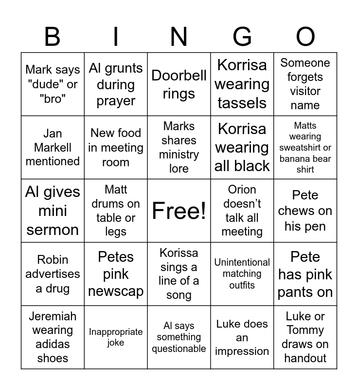 This bingo card has a free space and 34 words: Maryn makes a pun, Luke does an impression, Chalk talk, Mark is gone, Robin advertises a drug, New food in meeting room, Someone forgets visitor name, Jeremiah wearing adidas shoes, Al grunts during prayer, Luke fake laughs, Marks shares ministry lore, Doorbell rings, Dramatic reaction from Robin, Maryn makes a noise during prayer, Orion doesn’t talk all meeting, Matts wearing sweatshirt or banana bear shirt, Inappropriate joke, Al gives mini sermon, Petes pink newscap, Unintentional matching outfits, Korissa sings a line of a song, Phone goes off, Mark says "dude" or "bro", Pete chews on his pen, Al says something questionable, Luke or Tommy draws on handout, Korrisa wearing tassels, Nate says "great question", Korrisa wearing all black, Jan Markell mentioned, Al or Leanne call themself old, Matt drums on table or legs, Pete has pink pants on and Sophia wearing new balance.