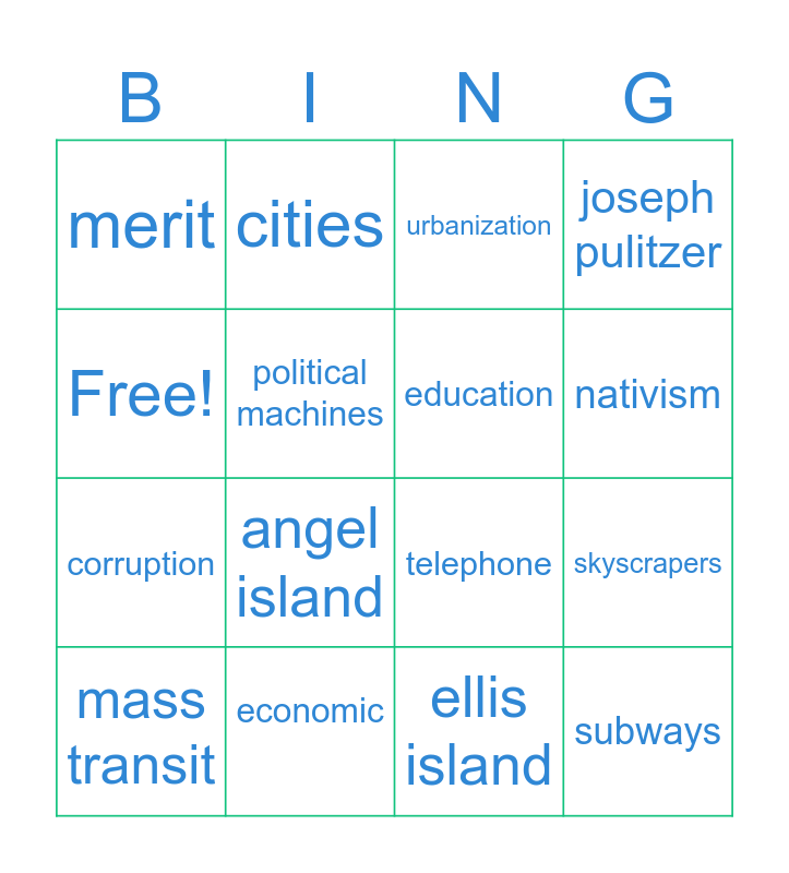 This bingo card has 16 words: economic, skyscrapers, urbanization, merit, corruption, cities, telephone, ellis island, Free!, political machines, mass transit, joseph pulitzer, angel island, nativism, education and subways.