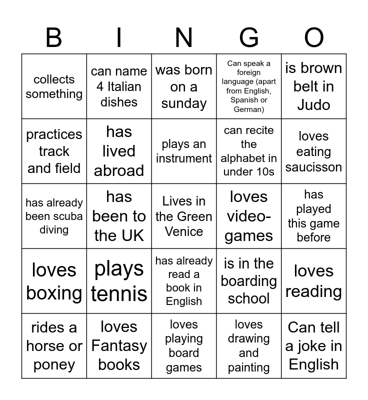 This bingo card has a free space and 24 words: plays tennis, loves Fantasy books, plays an instrument, rides a horse or poney, is brown belt in Judo, collects something, practices track and field, can name 4 Italian dishes, loves video-games, has already read a book in English, can recite the alphabet in under 10s, has already been scuba diving, is in the boarding school, loves reading, has lived abroad, loves drawing and painting, has played this game before, was born on a sunday, loves eating saucisson, has been to the UK, Can tell a joke in English, loves boxing, Can speak a foreign language (apart from English, Spanish or German) and loves playing board games.
