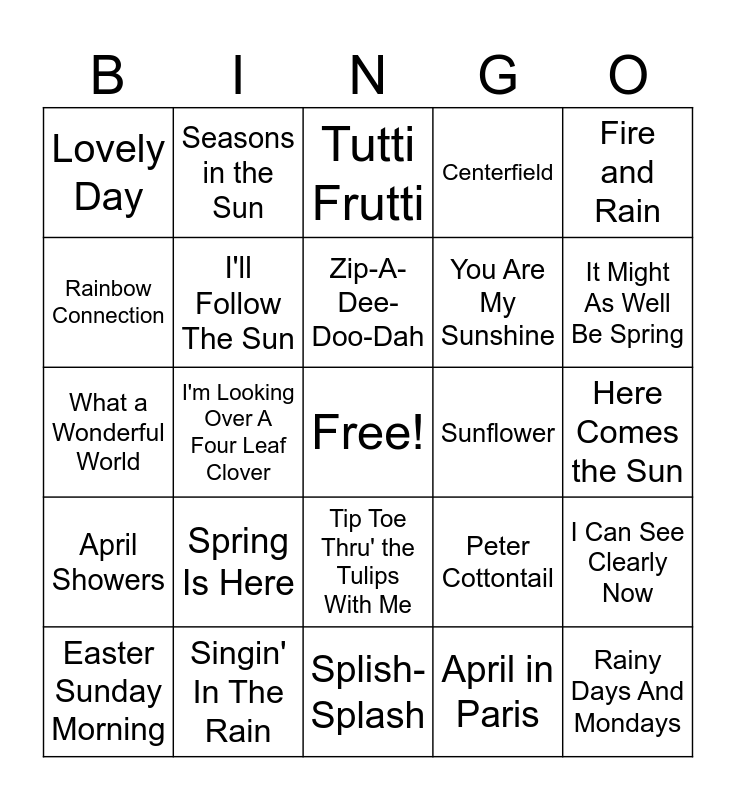 This bingo card has a free space and 28 words: I Can See Clearly Now, Sunshine On My Shoulders, You Are My Sunshine, April in Paris, Rainbow Connection, Tutti Frutti, Seasons in the Sun, April Showers, Sunflower, Easter Sunday Morning, What a Wonderful World, Centerfield, Singin' In The Rain, Splish-Splash, It Might As Well Be Spring, Sunshine, Lollipops And Rainbows, Spring Is Here, I'll Follow The Sun, Zip-A-Dee-Doo-Dah, Tip Toe Thru' the Tulips With Me, Lovely Day, Have You Ever Seen the Rain, Rainy Days And Mondays, I'm Looking Over A Four Leaf Clover, Here Comes the Sun, Peter Cottontail, Fire and Rain and Somewhere Over the Rainbow.