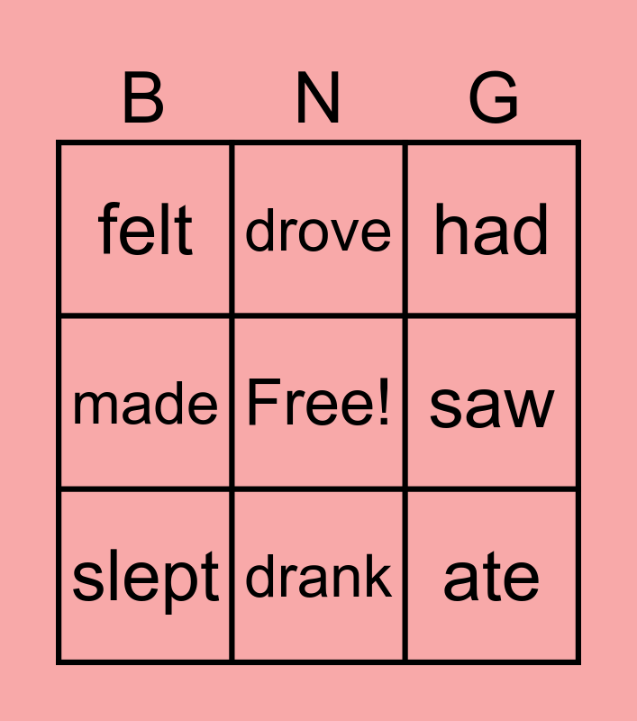 This bingo card has a free space and 11 words: worked, drank, ate, slept, drove, had, saw, woke up, made, felt and did.