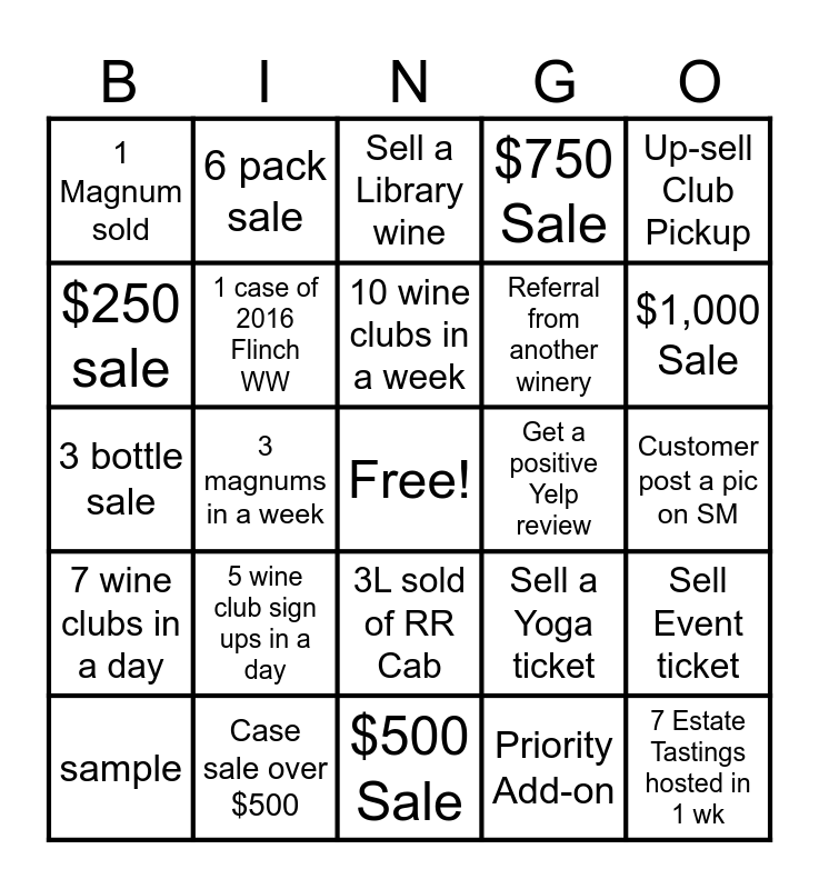 This bingo card has a free space and 24 words: sample, 5 wine club sign ups in a day, 10 wine clubs in a week, Priority Add-on, Up-sell Club Pickup, 1 Magnum sold, 6 pack sale, Sell a Library wine, Get a positive Yelp review, Customer post a pic on SM, 3 bottle sale, 1 case of 2016 Flinch WW, Sell a Yoga ticket, Sell Event ticket, $250 sale, Case sale over $500, $500 Sale, $750 Sale, $1,000 Sale, 7 wine clubs in a day, 3 magnums in a week, 3L sold of RR Cab, Referral from another winery and 7 Estate Tastings hosted in 1 wk.