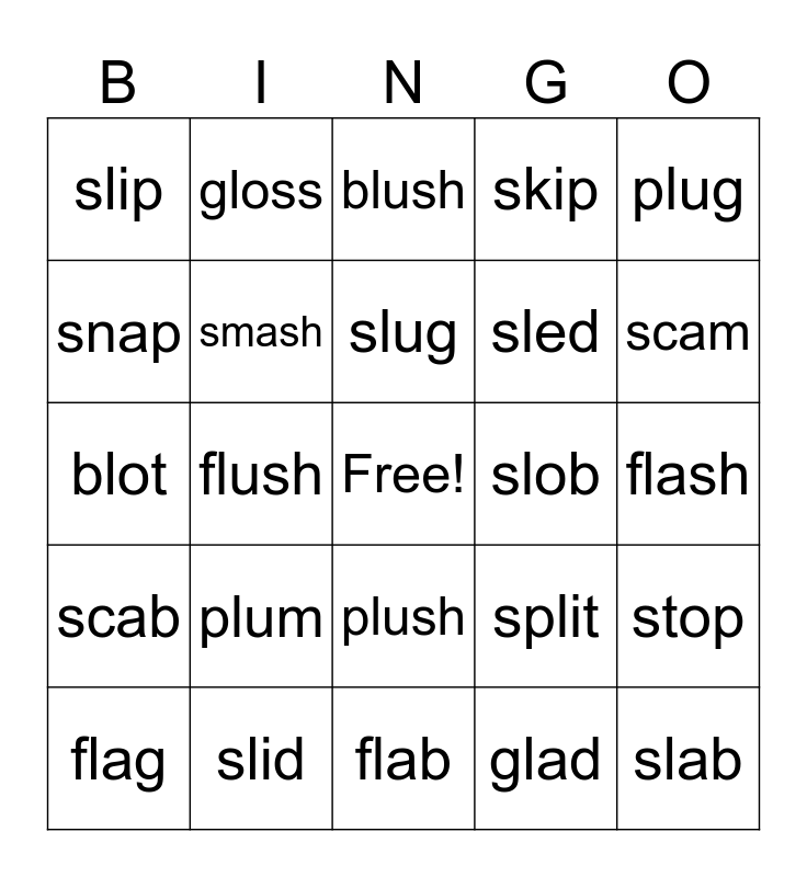 This bingo card has a free space and 24 words: plum, slid, slug, flag, plug, slip, snap, gloss, slob, plush, sled, blot, split, stop, smash, glad, flash, blush, scam, flush, slab, scab, skip and flab.