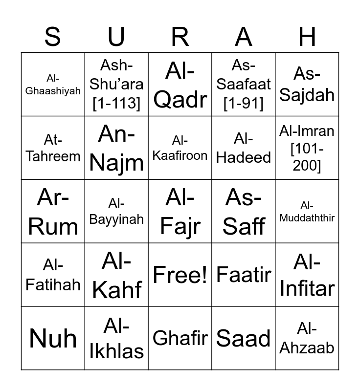 This bingo card has 26 words: Free!, Saad, Al-Kaafiroon, Al-Ikhlas, As-Sajdah, Al-Ghaashiyah, At-Tahreem, Ash-Shu’ara [1-113], Al-Muddaththir, Faatir, Al-Hadeed, Ar-Rum, Al-Infitar, Nuh, Al-Bayyinah, An-Nisa [1-88], As-Saafaat [1-91], Al-Fatihah, Al-Qadr, Al-Fajr, Al-Imran [101-200], Ghafir, As-Saff, Al-Kahf, An-Najm and Al-Ahzaab.