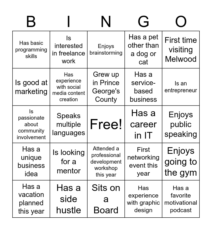 This bingo card has a free space and 30 words: Has a side hustle, pursuing further education, Speaks multiple languages, This year participated in a volunteer project, Has basic programming skills, Enjoys brainstorming, Has experience with social media content creation, Attended a professional development workshop this year, Has a career in IT, Sits on a Board, Enjoys public speaking, Has a favorite motivational podcast, Has experience with graphic design, Has a career in healthcare or wellness, Is an entrepreneur, Started a non-profit, First networking event this year, Has a unique business idea, Is looking for a mentor, First time visiting Melwood, Is passionate about community involvement, Is a mentor/wants to be a mentor, Is interested in freelance work, Has a service-based business, Is good at marketing, Has a pet other than a dog or cat, Enjoys going to the gym, Has a vacation planned this year, Grew up in Prince George's County and Has volunteered for Melwood.