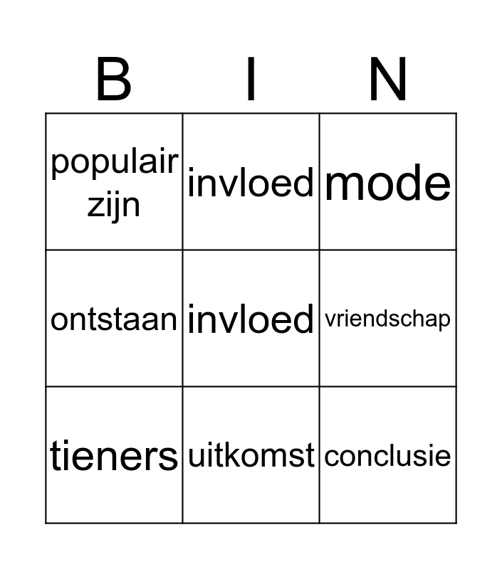 This bingo card has a free space and 8 words: vriendschap, mode, invloed, tieners, populair zijn, conclusie, ontstaan and uitkomst.