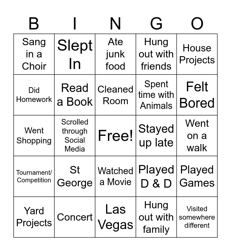 This bingo card has a free space and 25 words: St George, Las Vegas, Cleaned Room, Yard Projects, House Projects, Sang in a Choir, Did Homework, Slept In, Stayed up late, Watched a Movie, Spent time with Animals, Went Shopping, Played D & D, Played Games, Read a Book, Cooked or Baked something yummy!, Went on a walk, Ate junk food, Felt Bored, Scrolled through Social Media, Visited somewhere different, Concert, Tournament/ Competition, Hung out with friends and Hung out with family.