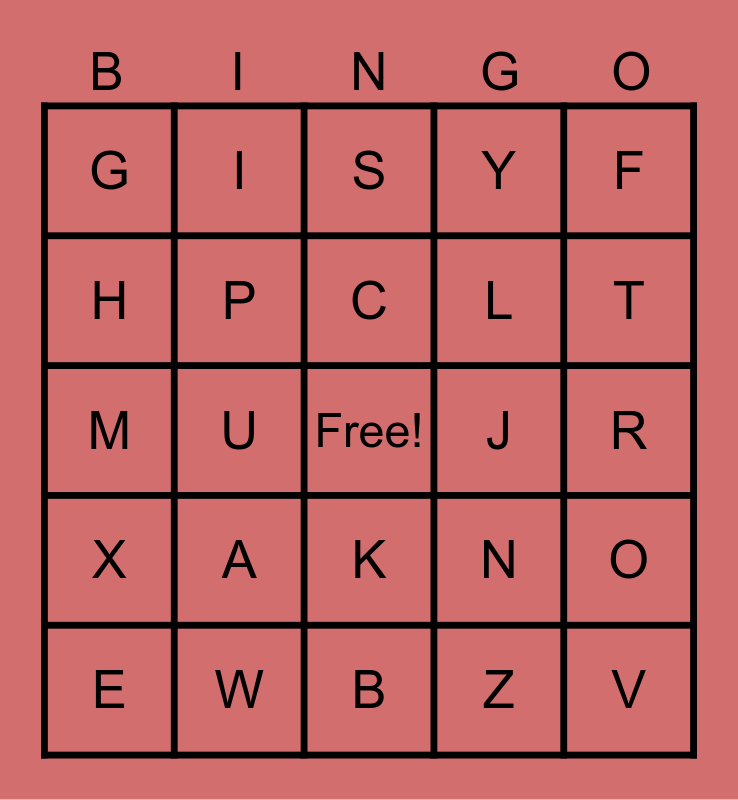 This bingo card has a free space and 25 words: A, B, C, E, F, G, H, I, J, K, L, M, N, O, P, Q, R, S, T, U, V, W, X, Y and Z.