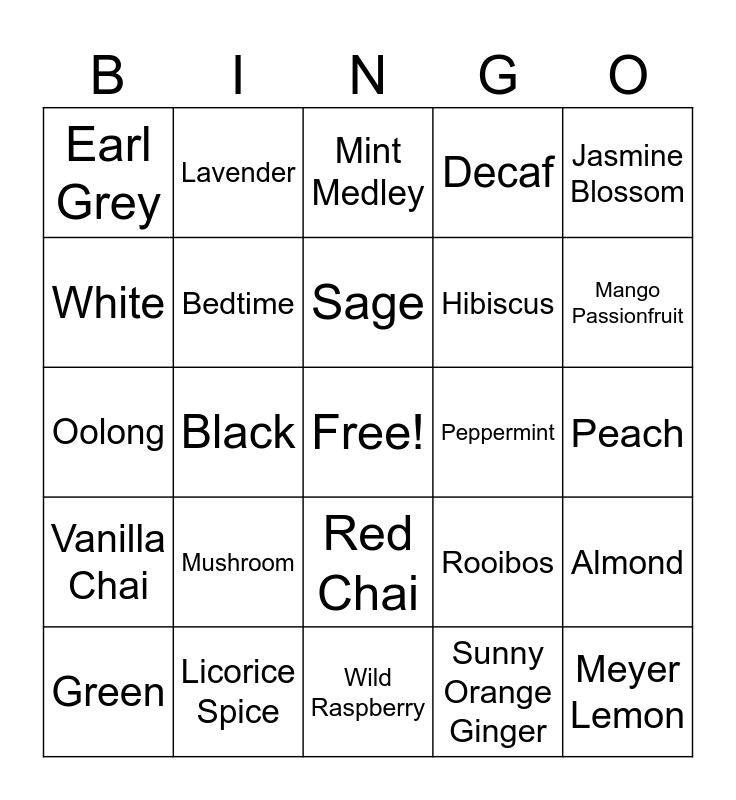 This bingo card has a free space and 29 words: Green, Turmeric, Black, Chamomile, Earl Grey, Mint Medley, Bedtime, Mushroom, Peppermint, Licorice Spice, Peach, Meyer Lemon, Wild Raspberry, Sunny Orange Ginger, Mango Passionfruit, Orange Spice, Red Chai, Vanilla Chai, Jasmine Blossom, Oolong, Rooibos, Matcha, Hibiscus, White, Decaf, Lavender, Almond, Sage and Apple Cider.