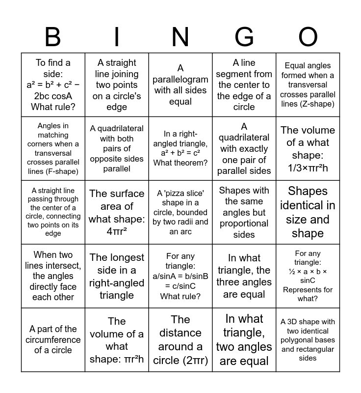 This bingo card has 25 words: The longest side in a right-angled triangle, The distance around a circle (2πr), In a right-angled triangle, a² + b² = c² What theorem?, A part of the circumference of a circle, Equal angles formed when a transversal crosses parallel lines (Z-shape), To find a side: a² = b² + c² − 2bc cosA What rule?, Angles in matching corners when a transversal crosses parallel lines (F-shape), A straight line joining two points on a circle's edge, Shapes with the same angles but proportional sides, For any triangle: a/sinA = b/sinB = c/sinC What rule?, A quadrilateral with exactly one pair of parallel sides, A straight line passing through the center of a circle, connecting two points on its edge, In what triangle, the three angles are equal, For any triangle: ½ × a × b × sinC Represents for what?, A quadrilateral with both pairs of opposite sides parallel, A 3D shape with two identical polygonal bases and rectangular sides, Shapes identical in size and shape, A parallelogram with all sides equal, The volume of a what shape: 1/3×πr²h, The surface area of what shape: 4πr², A 'pizza slice' shape in a circle, bounded by two radii and an arc, The volume of a what shape: πr²h, When two lines intersect, the angles directly face each other, A line segment from the center to the edge of a circle and In what triangle, two angles are equal.