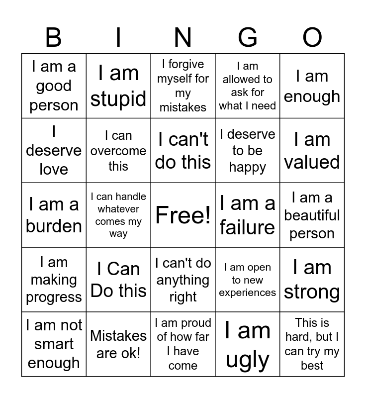 This bingo card has a free space and 24 words: I Can Do this, Mistakes are ok!, I can't do this, I am not smart enough, I am enough, I am a good person, I deserve love, I am stupid, I am a failure, I can't do anything right, I deserve to be happy, I am a burden, I am open to new experiences, I am strong, I can overcome this, I am ugly, I am a beautiful person, I forgive myself for my mistakes, I am valued, I can handle whatever comes my way, This is hard, but I can try my best, I am making progress, I am allowed to ask for what I need and I am proud of how far I have come.