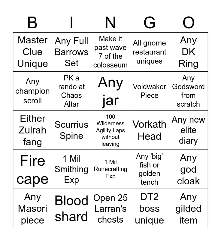 This bingo card has a free space and 24 words: 1 Mil Smithing Exp, Blood shard, Any jar, Any Masori piece, Any DK Ring, Master Clue Unique, Any champion scroll, Any Full Barrows Set, Vorkath Head, 1 Mil Runecrafting Exp, Voidwaker Piece, Either Zulrah fang, Any 'big' fish or golden tench, Any god cloak, PK a rando at Chaos Altar, DT2 boss unique, Any new elite diary, Make it past wave 7 of the colosseum, Any Godsword from scratch, Scurrius Spine, Any gilded item, Fire cape, All gnome restaurant uniques and Open 25 Larran's chests.