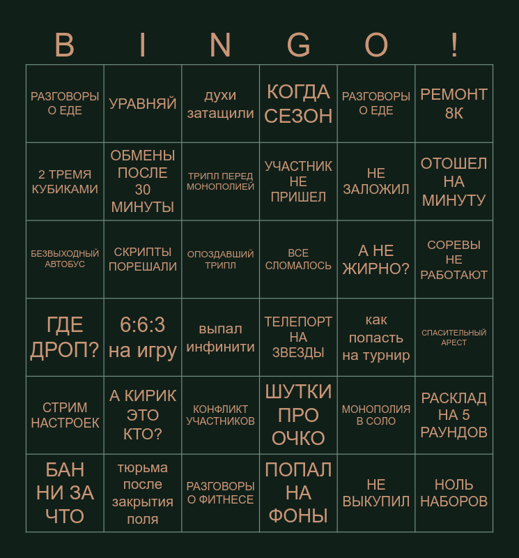 This bingo card has 36 words: ШУТКИ ПРО ОЧКО, КОНФЛИКТ УЧАСТНИКОВ, ПОПАЛ НА ФОНЫ, 2 ТРЕМЯ КУБИКАМИ, ГДЕ ДРОП?, ВСЕ СЛОМАЛОСЬ, ОБМЕНЫ ПОСЛЕ 30 МИНУТЫ, РАЗГОВОРЫ О ФИТНЕСЕ, РАЗГОВОРЫ О ЕДЕ, МОНОПОЛИЯ В СОЛО, ОТОШЕЛ НА МИНУТУ, КОГДА СЕЗОН, РАСКЛАД НА 5 РАУНДОВ, СКРИПТЫ ПОРЕШАЛИ, УЧАСТНИК НЕ ПРИШЕЛ, РАЗГОВОРЫ О ЕДЕ, СТРИМ НАСТРОЕК, А НЕ ЖИРНО?, БЕЗВЫХОДНЫЙ АВТОБУС, духи затащили, ОПОЗДАВШИЙ ТРИПЛ, 6:6:3 на игру, ТЕЛЕПОРТ НА ЗВЕЗДЫ, выпал инфинити, как попасть на турнир, УРАВНЯЙ, НЕ ЗАЛОЖИЛ, тюрьма после закрытия поля, ТРИПЛ ПЕРЕД МОНОПОЛИЕЙ, РЕМОНТ 8К, НОЛЬ НАБОРОВ, БАН НИ ЗА ЧТО, СПАСИТЕЛЬНЫЙ АРЕСТ, СОРЕВЫ НЕ РАБОТАЮТ, А КИРИК ЭТО КТО? and НЕ ВЫКУПИЛ.