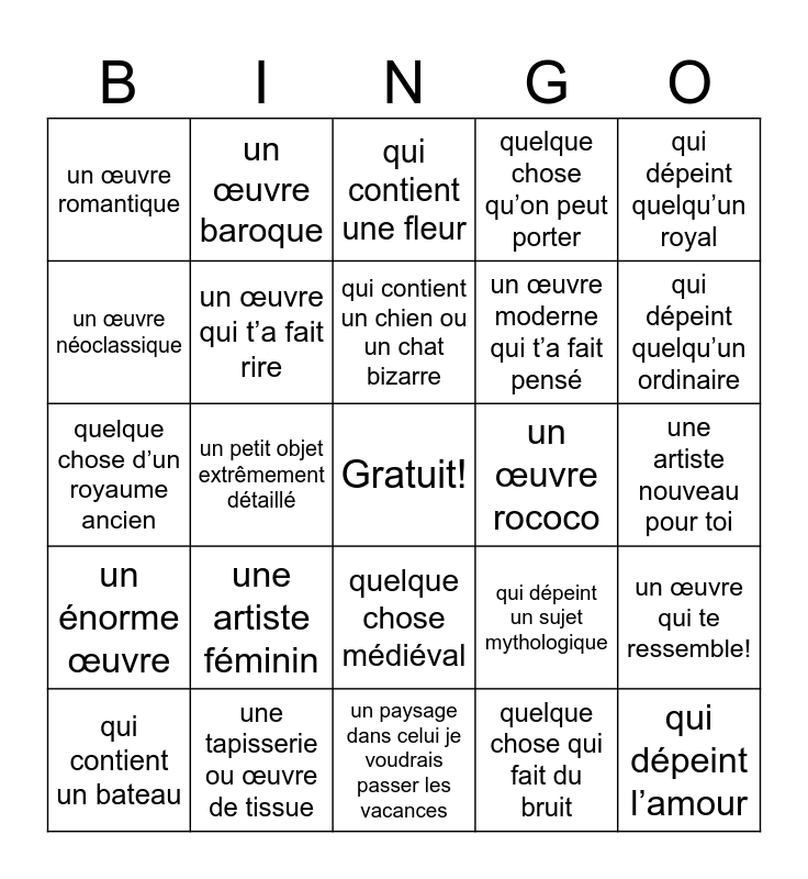 This bingo card has a free space and 25 words: une artiste féminin, un paysage dans celui je voudrais passer les vacances, qui contient un chien ou un chat bizarre, qui contient un bateau, qui dépeint quelqu’un royal, un œuvre romantique, un œuvre néoclassique, un œuvre baroque, un œuvre rococo, quelque chose médiéval, un œuvre moderne qui t’a fait pensé, quelque chose d’un royaume ancien, qui dépeint un sujet mythologique, un œuvre qui te ressemble!, un œuvre qui t’a fait rire, qui dépeint la morte, une artiste nouveau pour toi, qui contient une fleur, qui dépeint quelqu’un ordinaire, un petit objet extrêmement détaillé, qui dépeint l’amour, une tapisserie ou œuvre de tissue, un énorme œuvre, quelque chose qu’on peut porter and quelque chose qui fait du bruit.