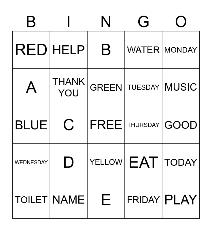 This bingo card has a free space and 24 words: D, NAME, GREEN, TOILET, MONDAY, RED, A, HELP, THURSDAY, YELLOW, TUESDAY, BLUE, EAT, TODAY, THANK YOU, FRIDAY, GOOD, B, MUSIC, C, PLAY, WEDNESDAY, WATER and E.