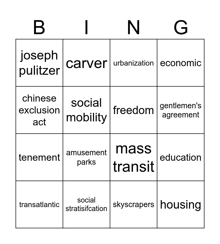This bingo card has 16 words: social stratisifcation, education, urbanization, joseph pulitzer, tenement, carver, mass transit, skyscrapers, chinese exclusion act, social mobility, transatlantic, economic, amusement parks, gentlemen's agreement, freedom and housing.