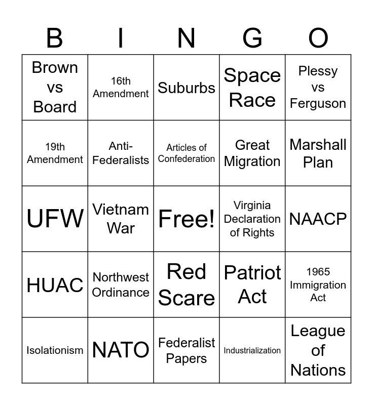 This bingo card has a free space and 25 words: Northwest Ordinance, Federalist Papers, Articles of Confederation, Isolationism, Plessy vs Ferguson, Brown vs Board, 19th Amendment, 16th Amendment, Virginia Declaration of Rights, Red Scare, Great Migration, UFW, Patriot Act, 1965 Immigration Act, Anti-Federalists, New Deal, NAACP, Suburbs, Marshall Plan, Vietnam War, League of Nations, NATO, HUAC, Space Race and Industrialization.
