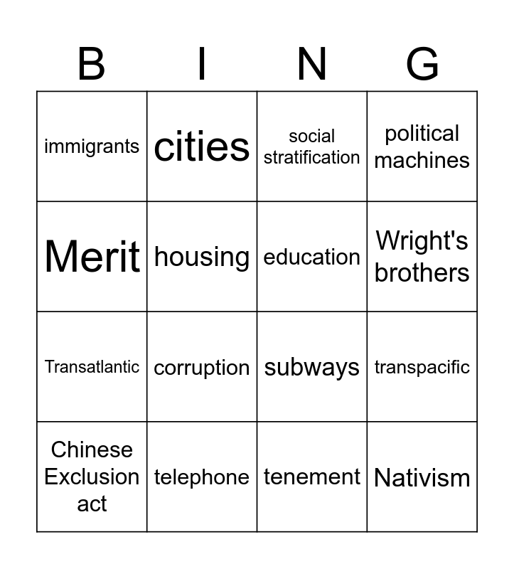 This bingo card has 16 words: telephone, transpacific, social stratification, immigrants, Transatlantic, cities, subways, tenement, Merit, housing, Chinese Exclusion act, political machines, corruption, Wright's brothers, education and Nativism.