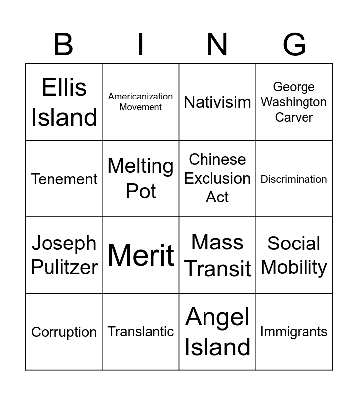 This bingo card has 16 words: Translantic, Social Mobility, Nativisim, Ellis Island, Joseph Pulitzer, Americanization Movement, Mass Transit, Angel Island, Tenement, Melting Pot, Corruption, George Washington Carver, Merit, Discrimination, Chinese Exclusion Act and Immigrants.